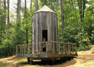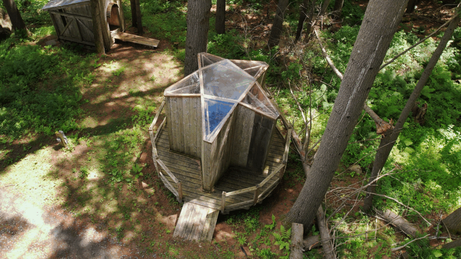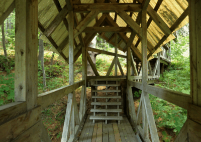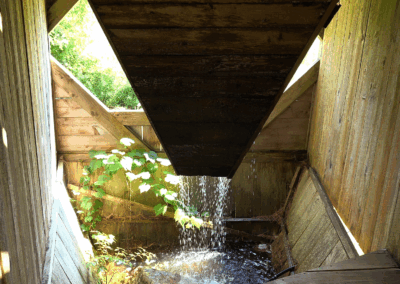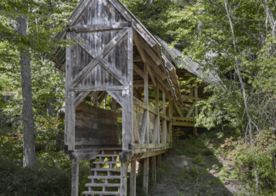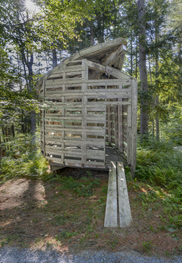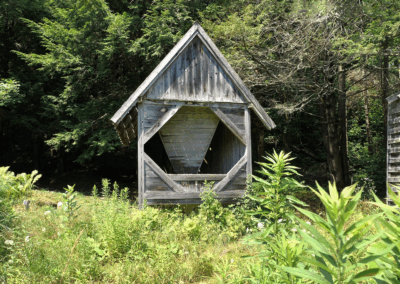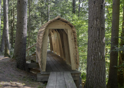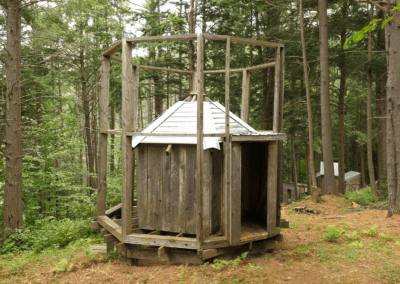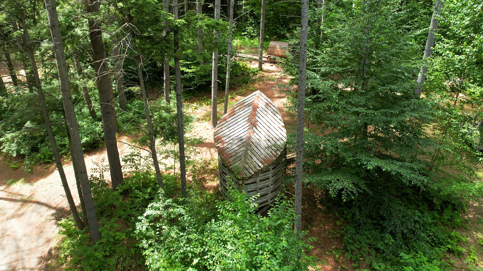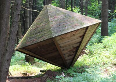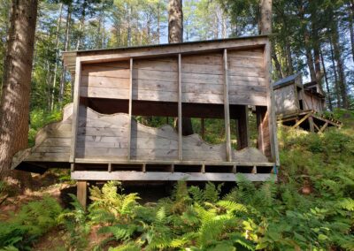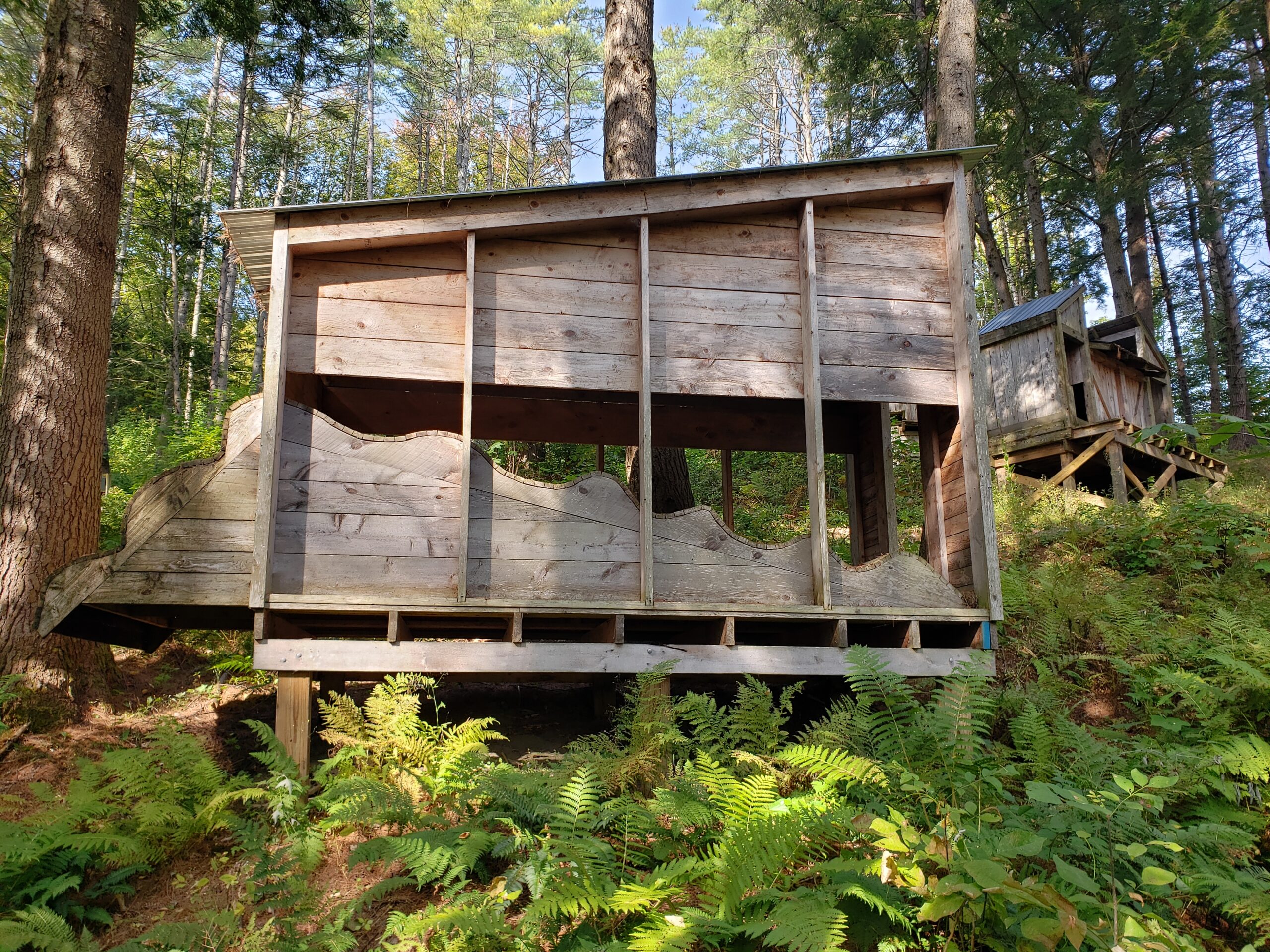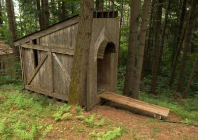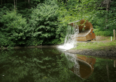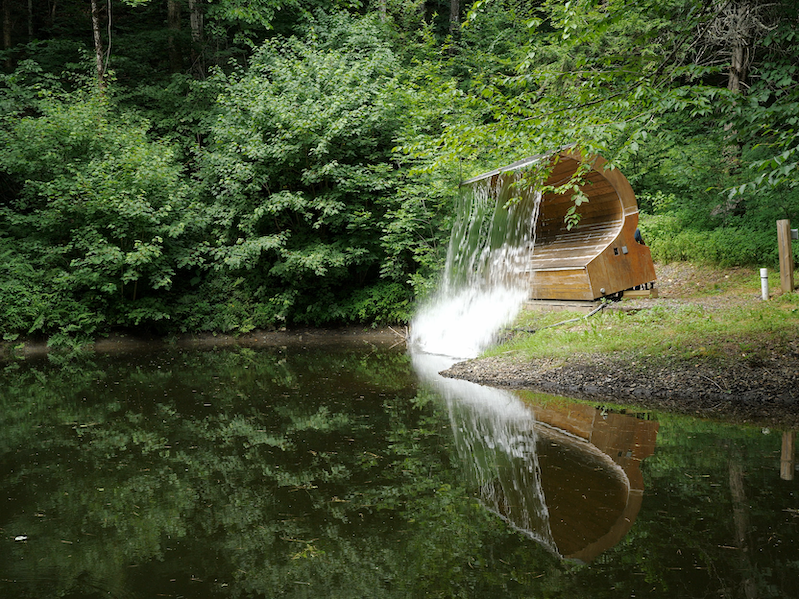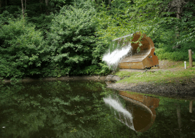 Vermont Village installations were built between the years 1991-2020. Many are activated by water that is gravity fed from a pond with sensors, valves, misters, and sprinklers controlling the flow. Though primarily constructed using hemlock wood sewn from fallen trees, some installations have been restored over time using pressurized wood and galvanized metal. Now, when an installation is rebuilt, moisture-resistant black locust wood is used.