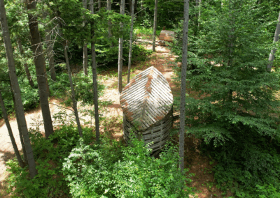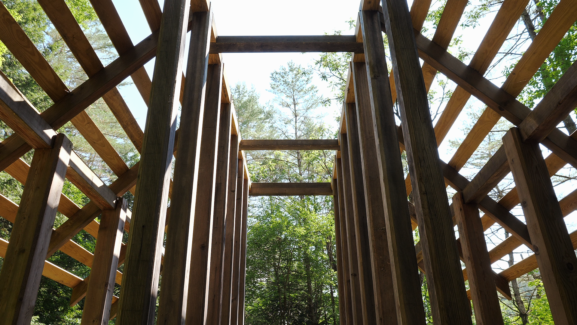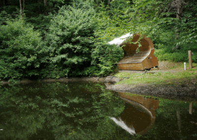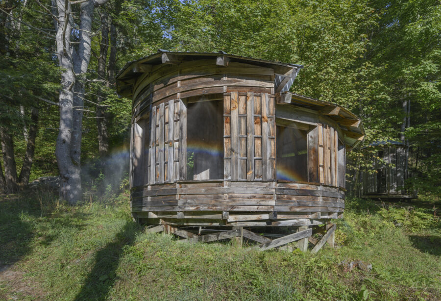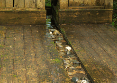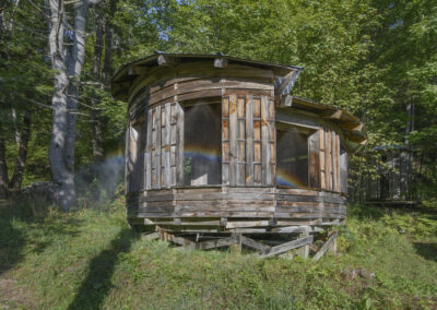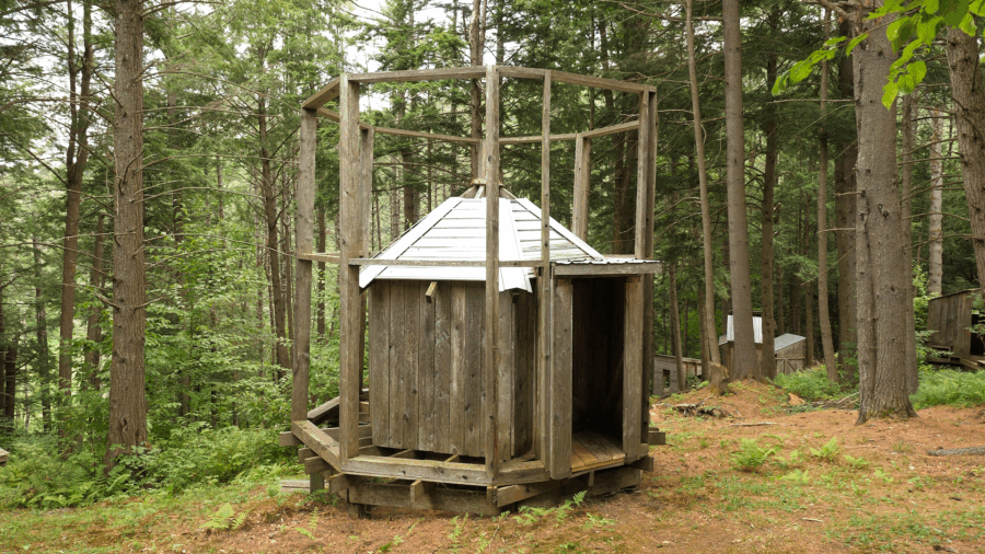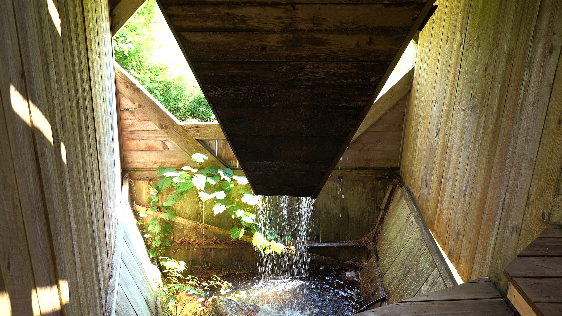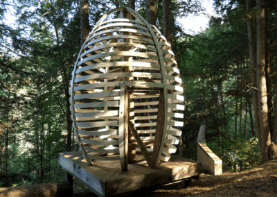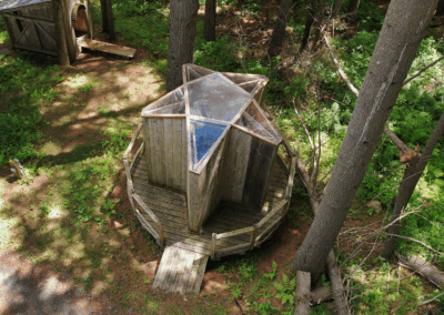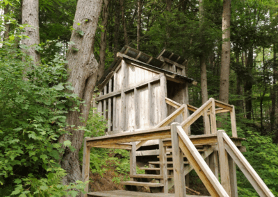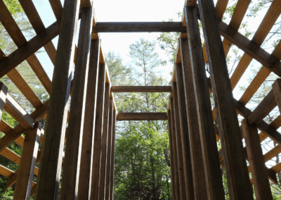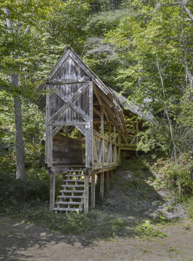Vermont Village installations were built between the years 1991-2020. Many are activated by water that is gravity fed from a pond with sensors, valves, misters, and sprinklers controlling the flow. Though primarily constructed using hemlock wood sewn from fallen trees, some installations have been restored over time using pressurized wood and galvanized metal. Now, when an installation is rebuilt, moisture-resistant black locust wood is used.