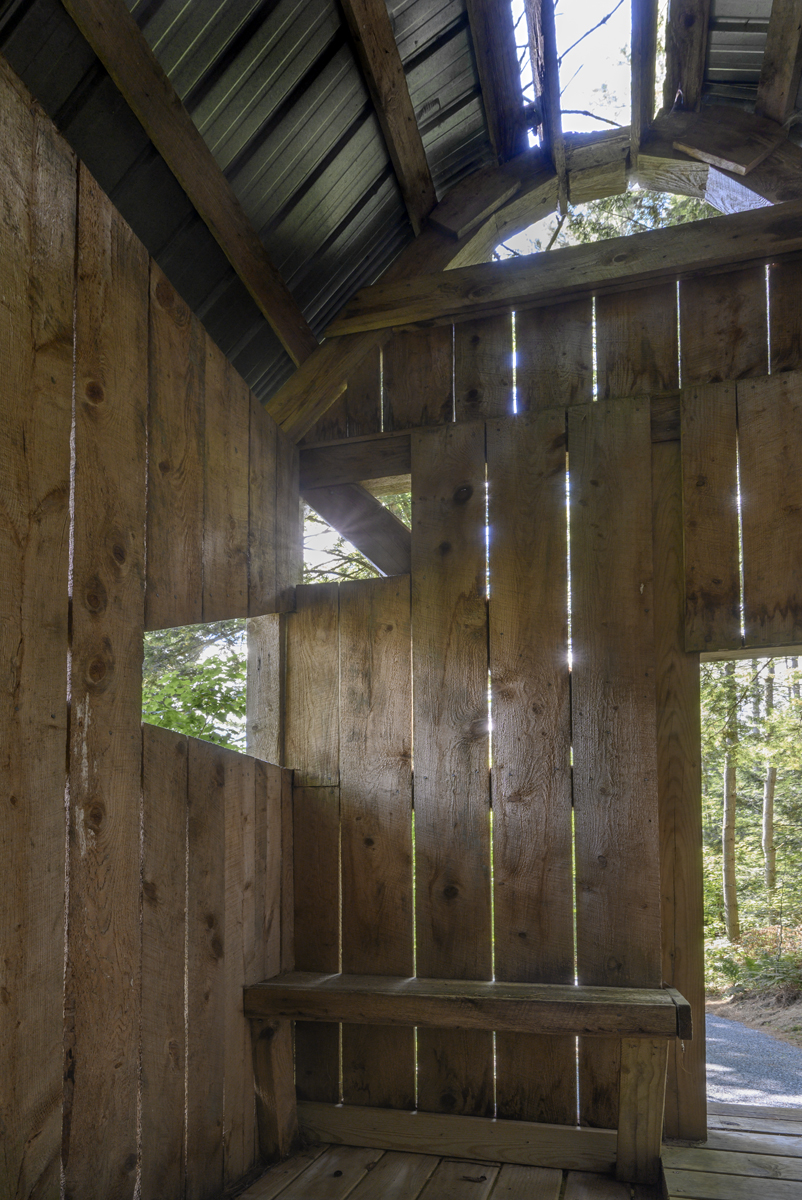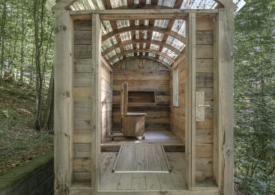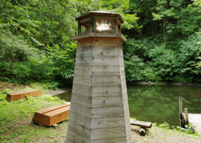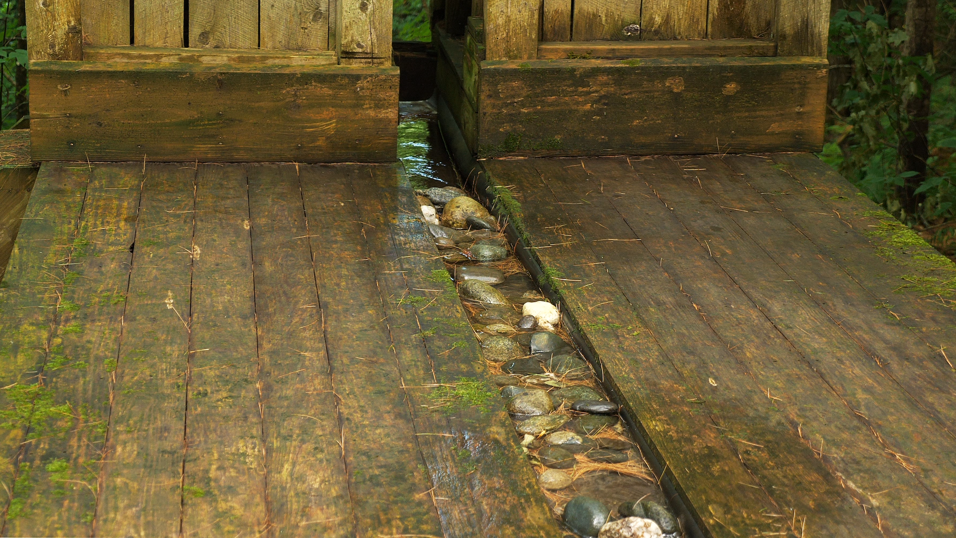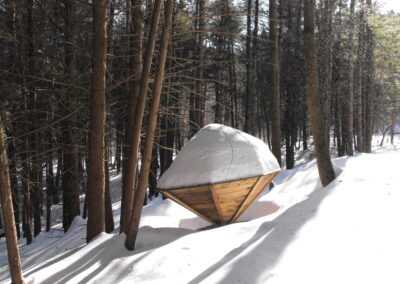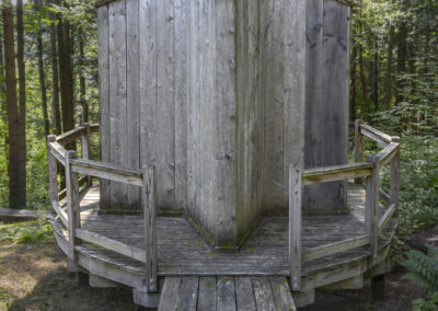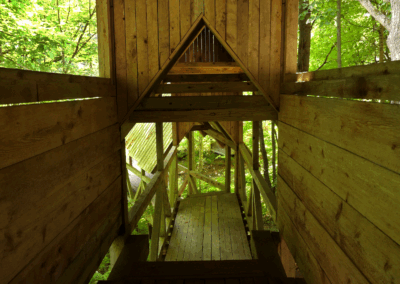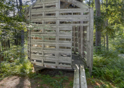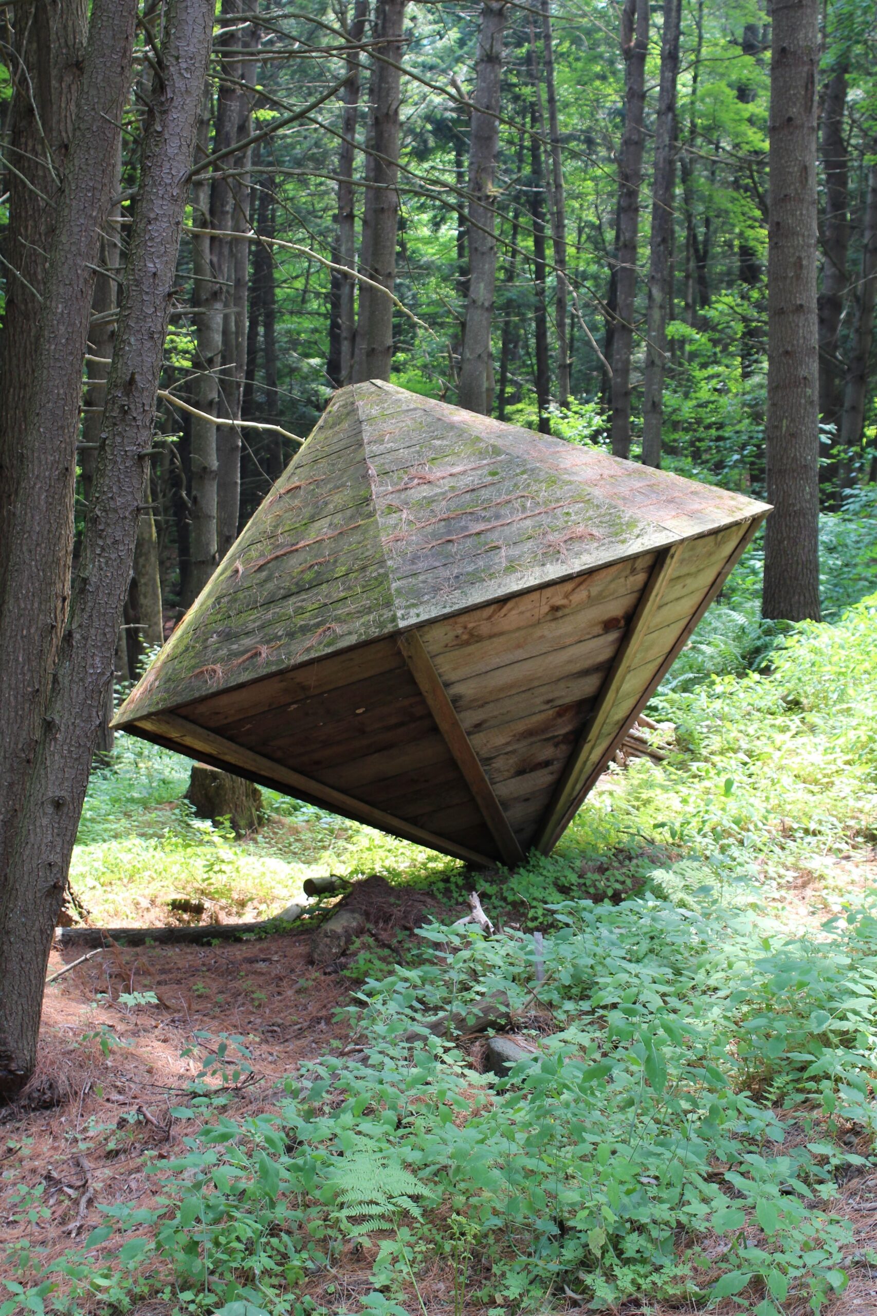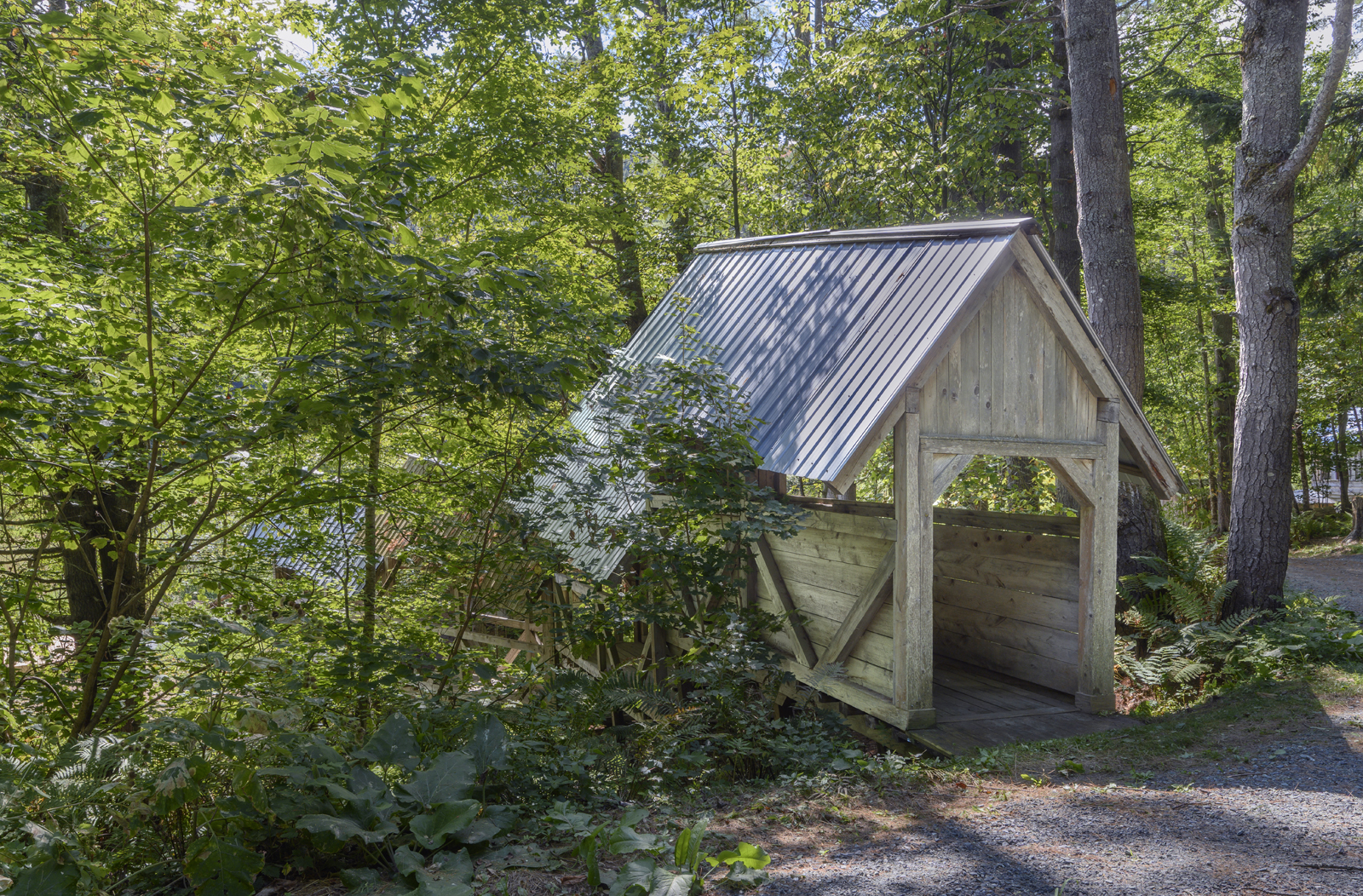 Vermont Village installations were built between the years 1991-2020. Many are activated by water that is gravity fed from a pond with sensors, valves, misters, and sprinklers controlling the flow. Though primarily constructed using hemlock wood sewn from fallen trees, some installations have been restored over time using pressurized wood and galvanized metal. Now, when an installation is rebuilt, moisture-resistant black locust wood is used.