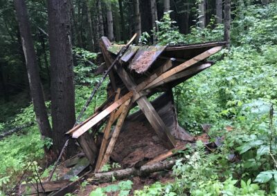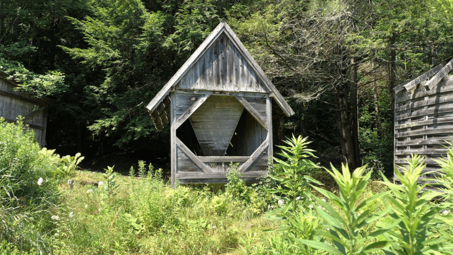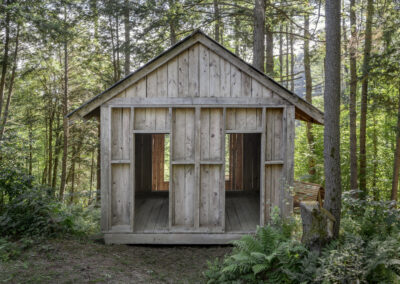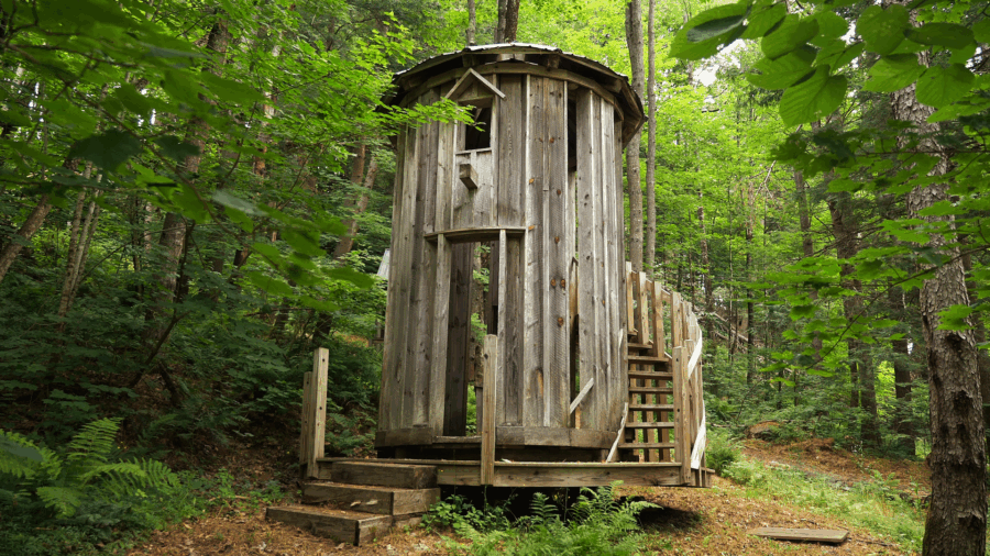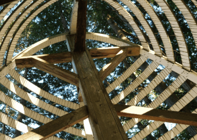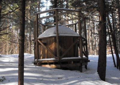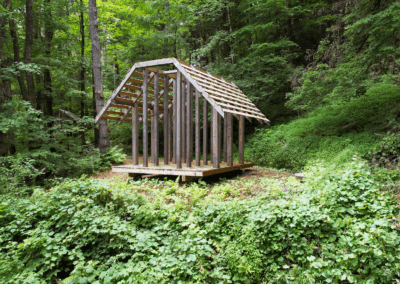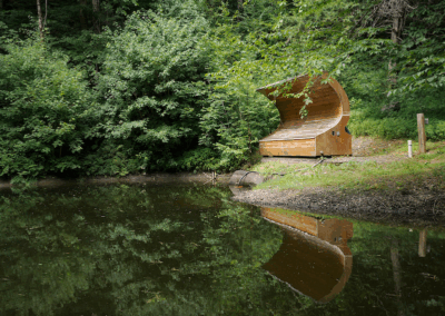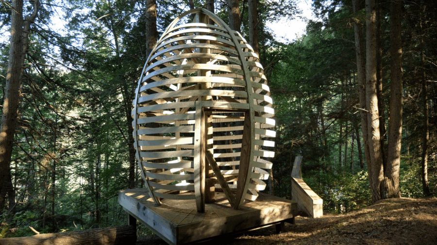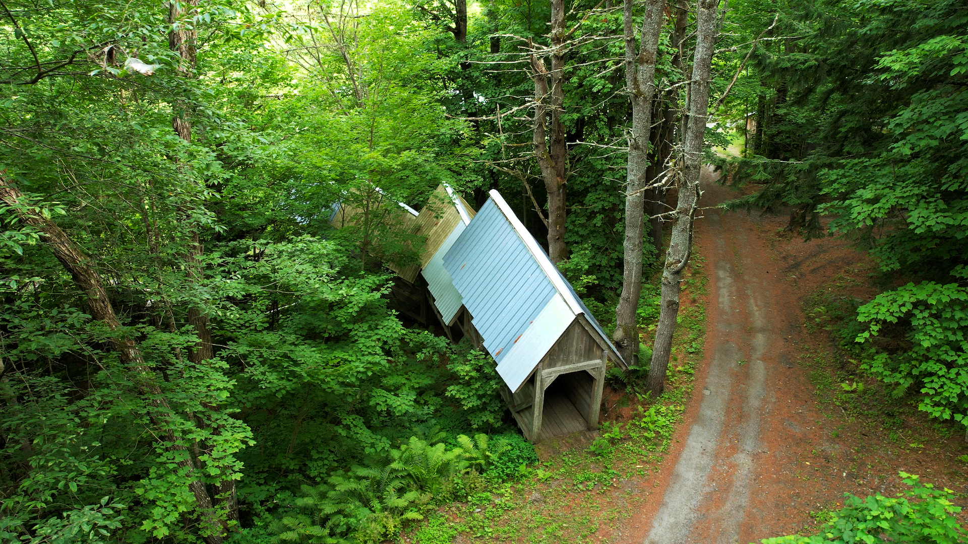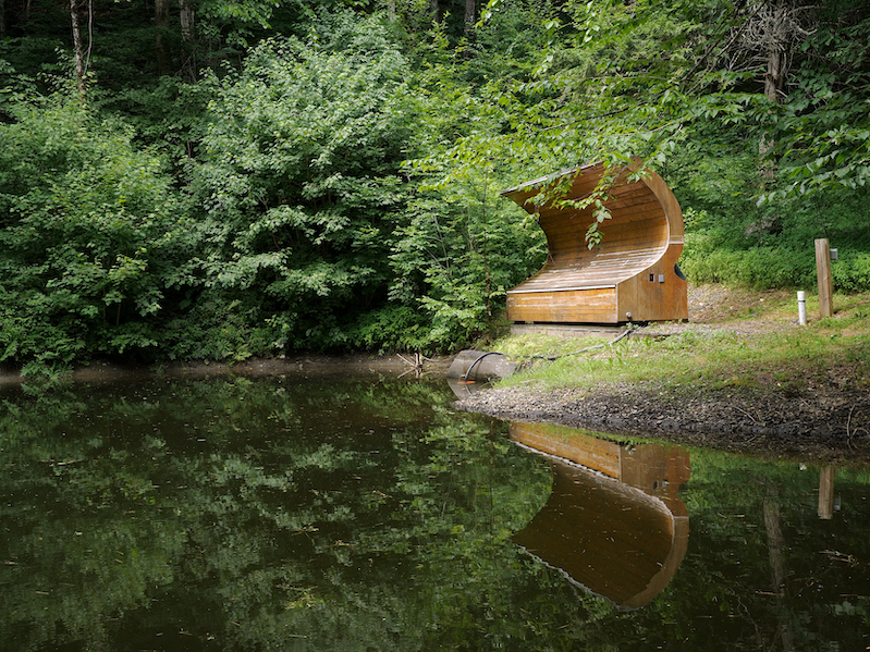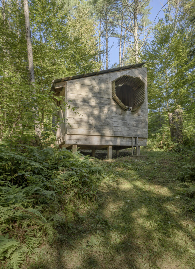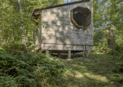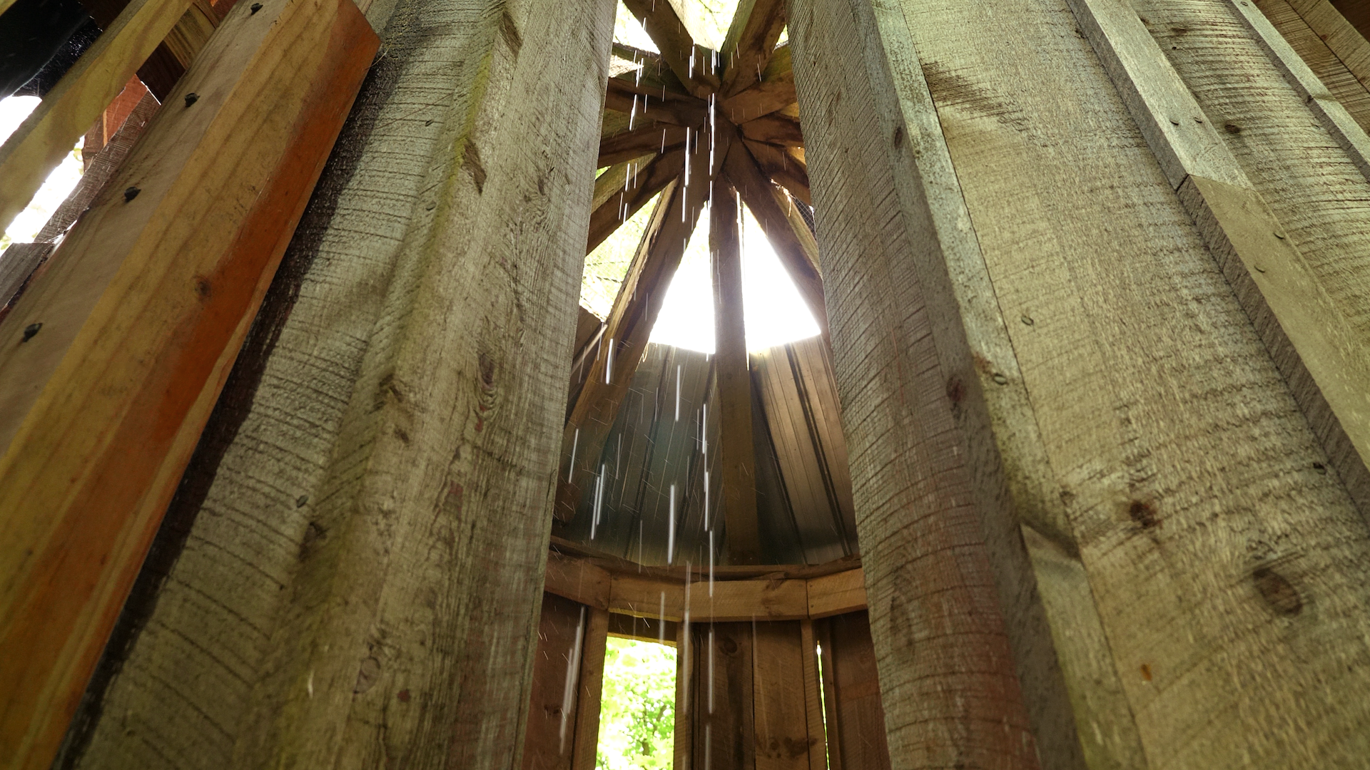 Vermont Village installations were built between the years 1991-2020. Many are activated by water that is gravity fed from a pond with sensors, valves, misters, and sprinklers controlling the flow. Though primarily constructed using hemlock wood sewn from fallen trees, some installations have been restored over time using pressurized wood and galvanized metal. Now, when an installation is rebuilt, moisture-resistant black locust wood is used.