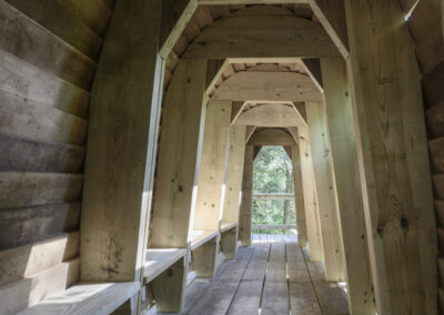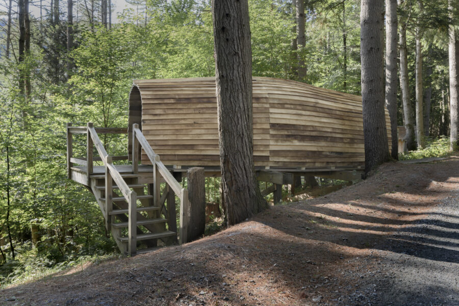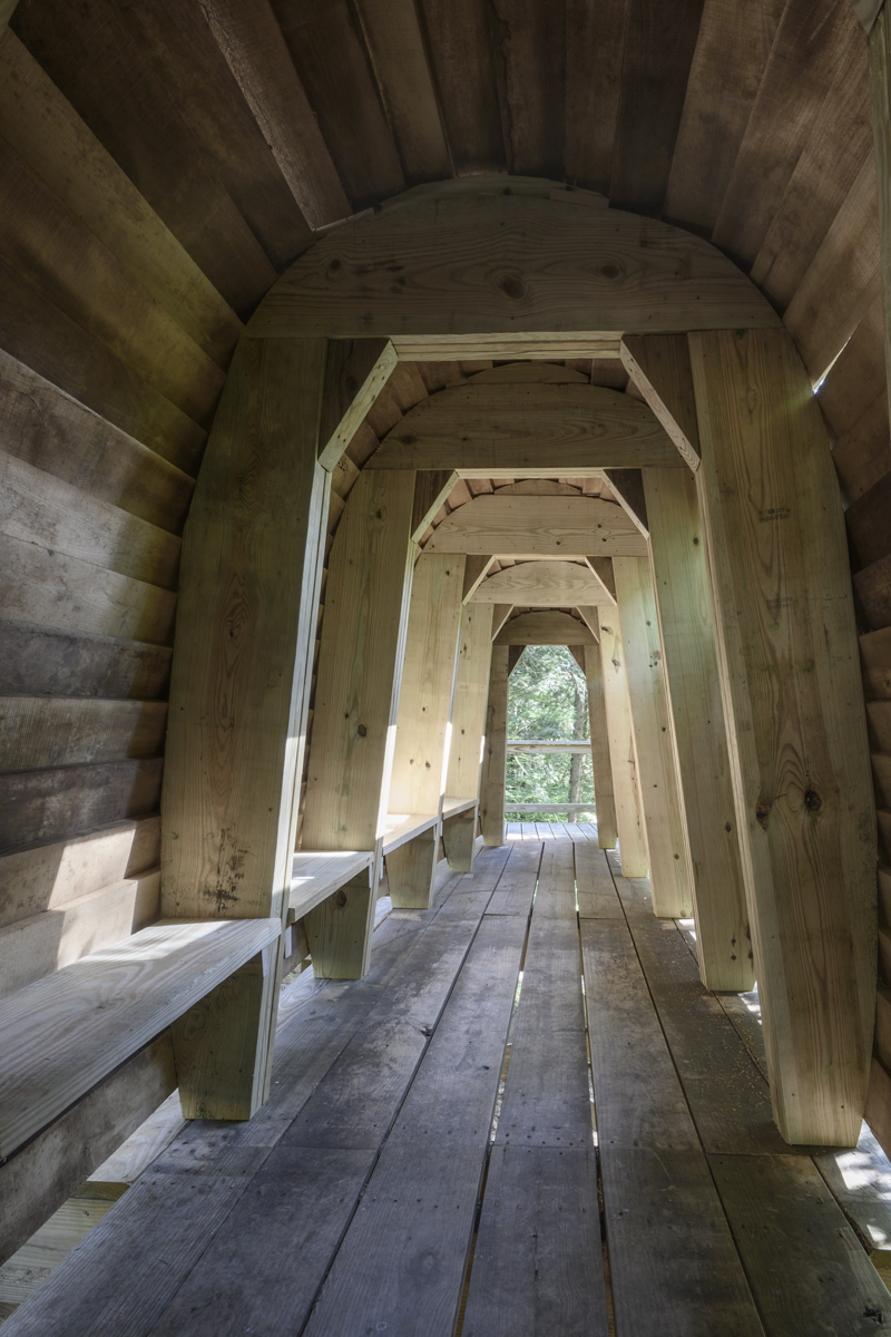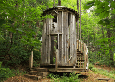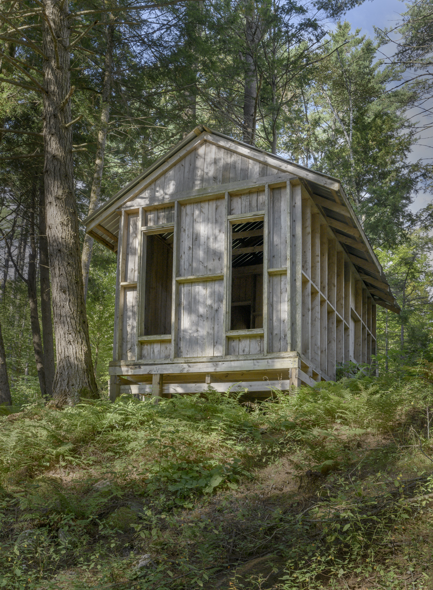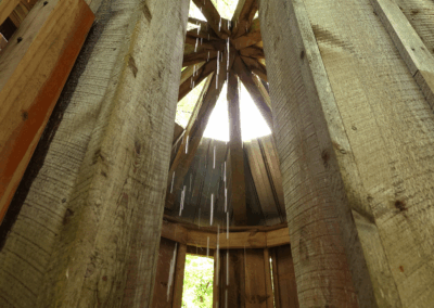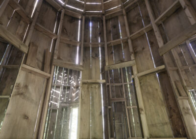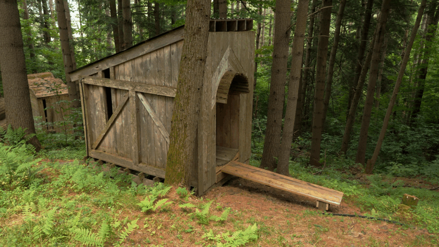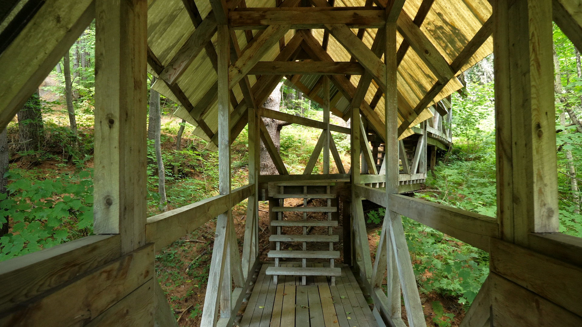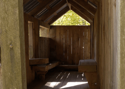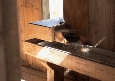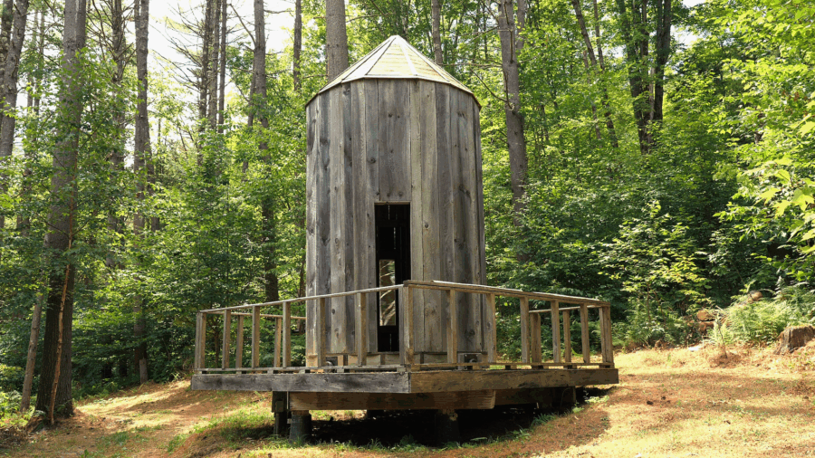 Vermont Village installations were built between the years 1991-2020. Many are activated by water that is gravity fed from a pond with sensors, valves, misters, and sprinklers controlling the flow. Though primarily constructed using hemlock wood sewn from fallen trees, some installations have been restored over time using pressurized wood and galvanized metal. Now, when an installation is rebuilt, moisture-resistant black locust wood is used.