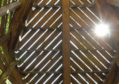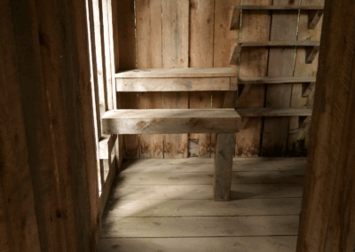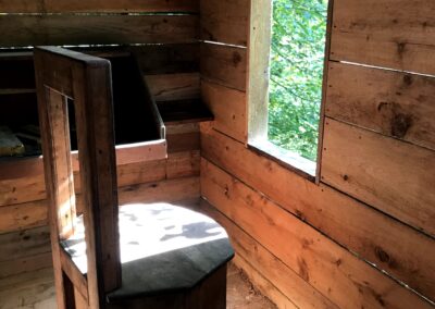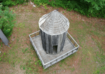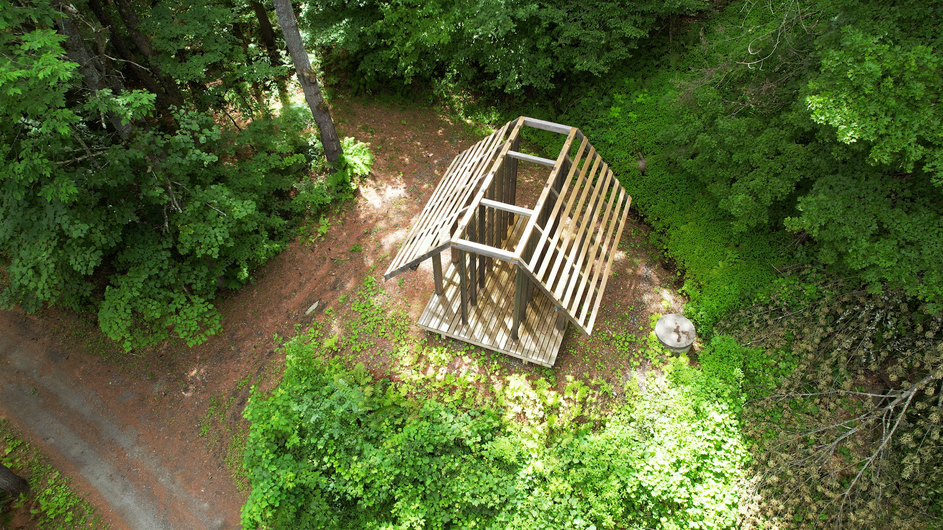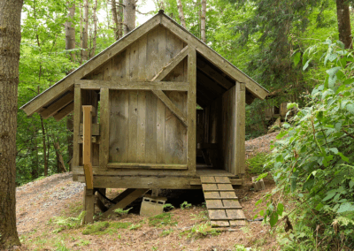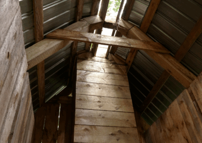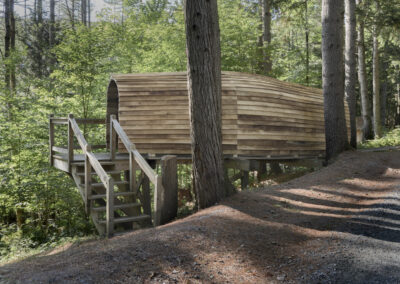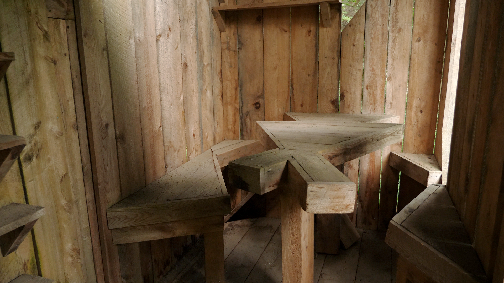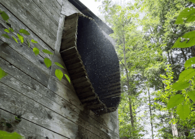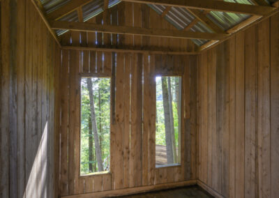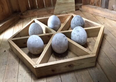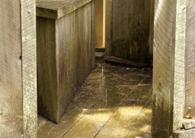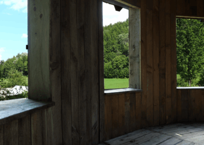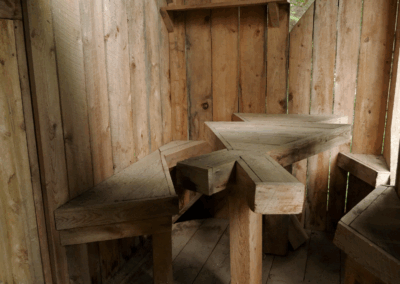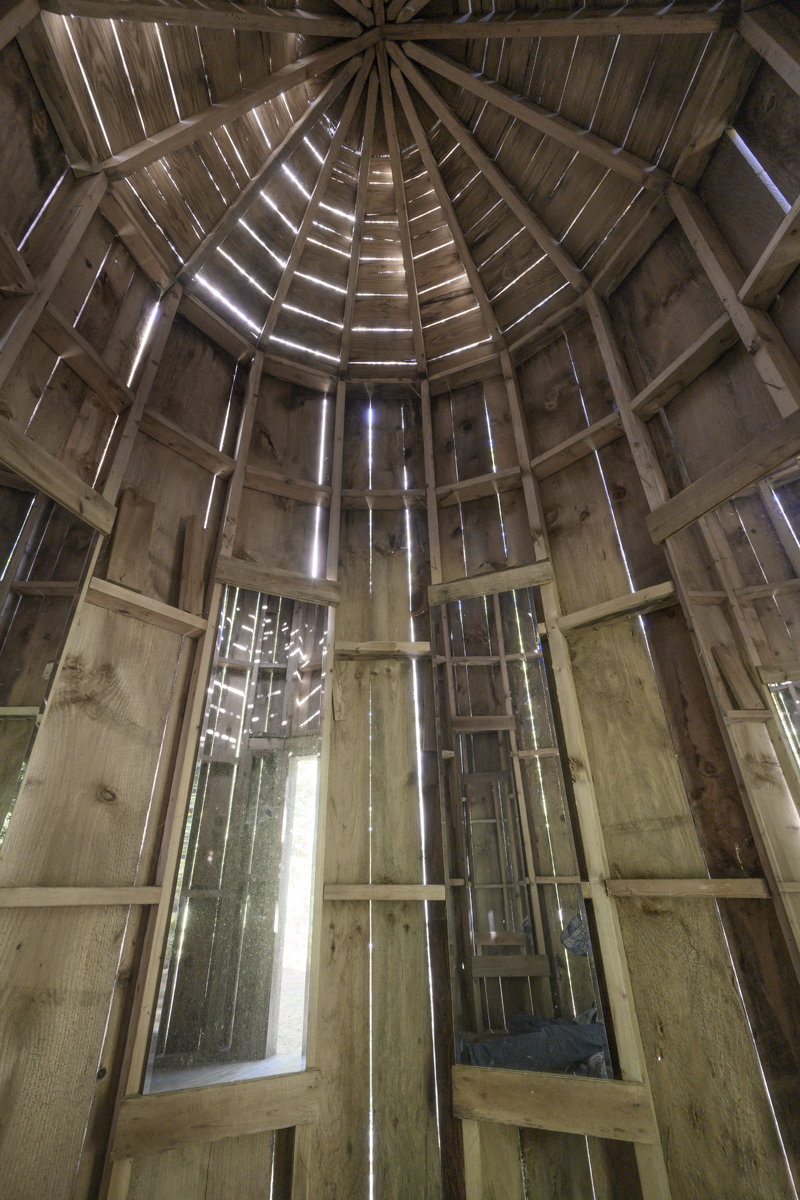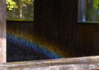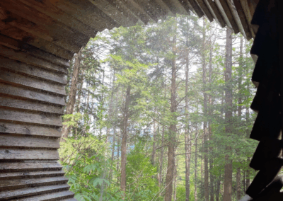 Vermont Village installations were built between the years 1991-2020. Many are activated by water that is gravity fed from a pond with sensors, valves, misters, and sprinklers controlling the flow. Though primarily constructed using hemlock wood sewn from fallen trees, some installations have been restored over time using pressurized wood and galvanized metal. Now, when an installation is rebuilt, moisture-resistant black locust wood is used.